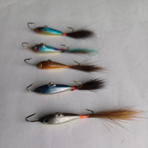 Uudenveroiset karvapyrstöiset tasapainopilkit 5 kpl. Rungon pituus 25 mm. Pituus koukun päästä toisen koukun päähän 35 mm. Painot 4-5 g välillä. Nouto ja käteinen.