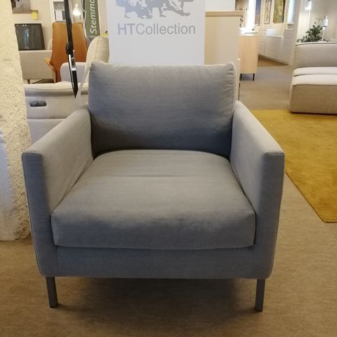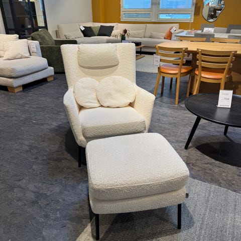 Sitsin Emma-nojatuoli, myymälän mallikappale. Tuoli on irtoverhoiltu Poppy Off White -kankaalla. Jalat tammea.