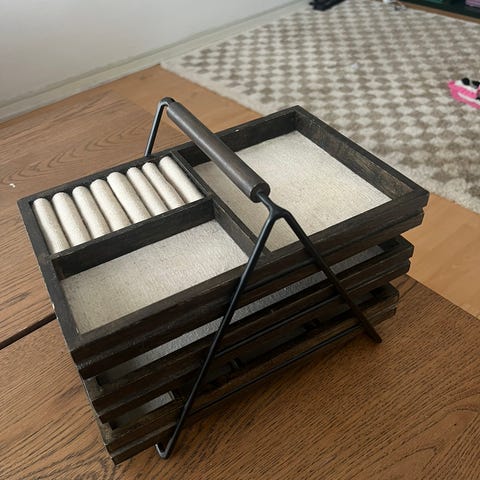 Pieni, puinen matkaikoni. Sulkeutuu kolmeen osaan.