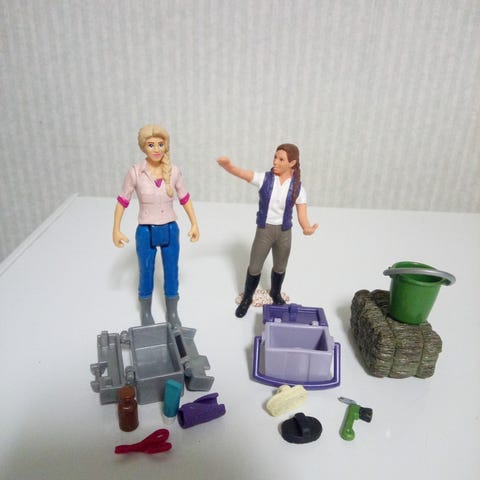 Tässä setissä on paljon pikkutavaroita kahden lapsihahmon lisäksi. Koirankoppi, maastoeste/puunrunko, rengas agilityyn, varsa, puksipuut ja retkitarvikkeet. Kaikki ovat aitoja Schleichejä js sopivat täydentämään tallialuetta.