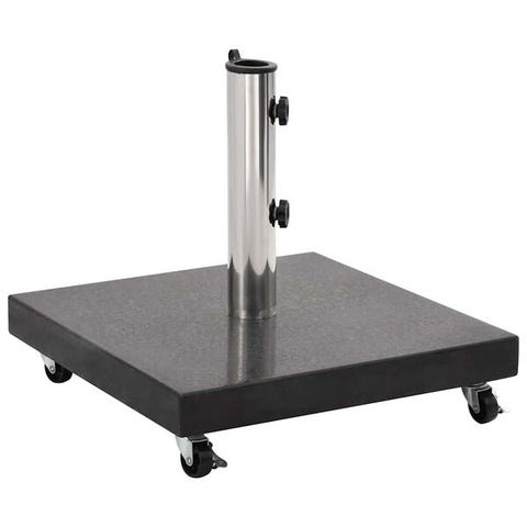 Vahvasta graniitista valmistettu, 30 kg painava aurinkovarjon alusta on erittäin vakaa ja varmistaa, että varjosi pysyy pystyssä tuulisellakin säällä. Aurinkovarjotelineessä on kaksi lukittuvaa pulttia, jotka pitävät varjon paikoillaan. Mukana tulee yksi sovitinosa, jonka ansiosta aurinkovarjotelineeseen voidaan laittaa kaikki varjotangot, joiden halkaisija on 38/48 mm. Lisäksi 4 pyörän avulla aurinkovarjon alustaa voidaan liikuttaa vapaasti.