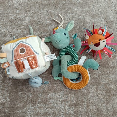 Vauvalelut setti, johon kuuluu useita erilaisia leluja pienelle lapselle. Kuvissa näkyy monivärinen muovinen helistin, muovinen sinivihreä pingviinilelu, pehmeä valkoinen pehmolelu, pehmeä lehmähahmoinen tyyny-/pehmolelu sekä monivärinen muovinen aktivointikuutio. Lelut on valmistettu pääosin muovista ja tekstiilimateriaaleista. Sopii vauvan ja taaperon leikkeihin ja aistikokemusten tukemiseen, kuten tarttumisen, ravistelun ja tutkimisen harjoitteluun.