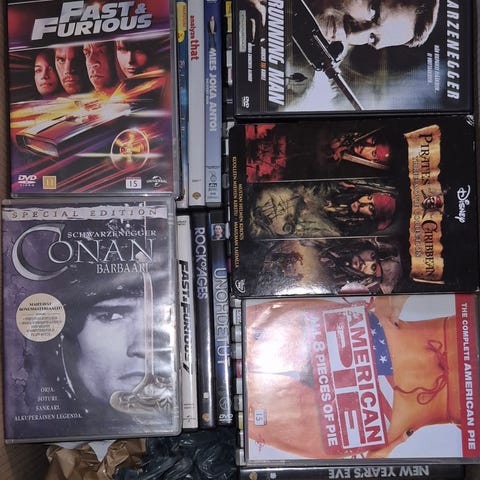 Sekalaiset elokuvat DVD-kokoelma. Kokoelmaan sisältyy useita eri elokuvia, muun muassa kotimaisia ja ulkomaisia nimikkeitä. Tallenteet ovat DVD-levyjä alkuperäisissä koteloissaan. Soveltuu DVD-soittimella katsottavaksi elokuvakokoelman täydentämiseen tai usean eri elokuvan hankkimiseen kerralla.