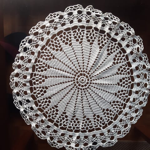 Tämä 1970‑luvun pitsiliina on juuri sellainen löytö, joka tuo kotiin lämpimän retrofiiliksen. Vihreä sävy on pehmeä ja luonnollinen, ei liian kirkas, vaan sellainen joka sopii monenlaiseen sisustukseen. Kuvio on tehty käsin virkaten, ja siinä toistuu kaunis, ilmava ruutukuvio, joka tekee pinnasta kevyen ja elävän näköisen.