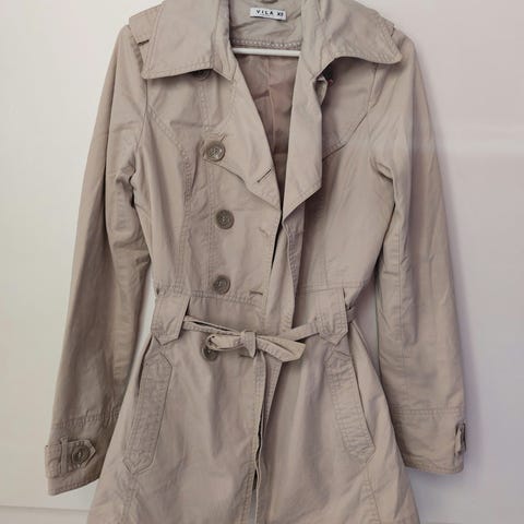 Tyylikäs ja ajaton VILA-trenssitakki koossa L. Klassinen malli kauniilla kauluksella ja kaksirivisellä nappikiinnityksellä. Uutena ostettu. Hyvä käytetty kunto. Toisessa olkapäässä ja hihassa normaalia käytön jälkeä (näkyy kuvissa). Ehjä ja siisti. Pituus n. 88cm ja hartiasaumojen väli 44cm. Kevyt ja monikäyttöinen takki kevääseen ☀️