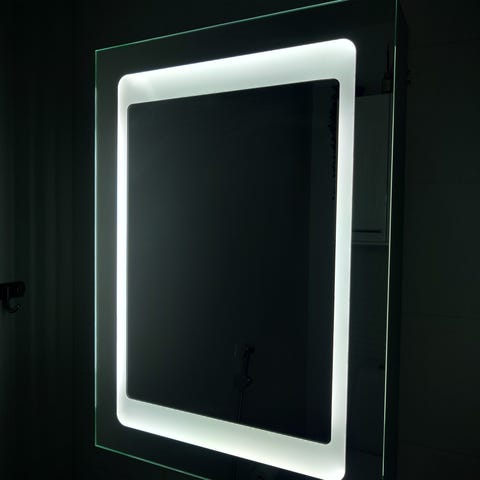 Valkoinen peilikaappi kylpyhuoneeseen. Kaapissa on kaksi lasihyllyä sisällä ja etuosassa peiliovet metallisilla saranoilla. Yläosassa on valaisinosa, joka on tarkoitettu kytkettäväksi sähköverkkoon. Soveltuu seinään kiinnitettäväksi säilytykseen esimerkiksi kylpyhuonetarvikkeille ja lääkkeille. Kaappi ja ovet ovat irrotettuina, joten ne voidaan kuljettaa ja asentaa uudelleen.