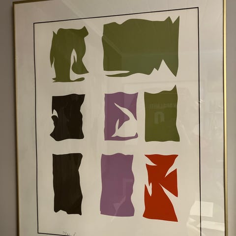 Serigrafia "Linnut", jonka on signeerannut Pauli Vuorisalo -89. Teos on numeroitu 56/60 ja esittää ihmishahmoa ja lintuja. Kehystetty yksinkertaisella kehyksellä.