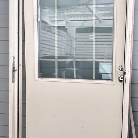 Valkoinen puinen lasi-ikkunallinen ovi