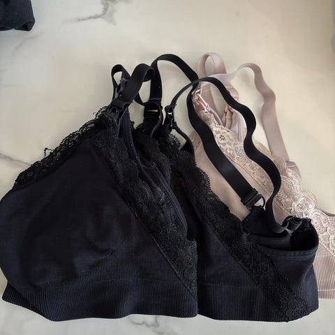 urheiluliivit, imetysliivit koko M. Kuvissa näkyvät kahdet liivit: mustat sekä harmaa–violetit. Liiveissä on säädettävät olkaimet. Mustat käyttämättömät.