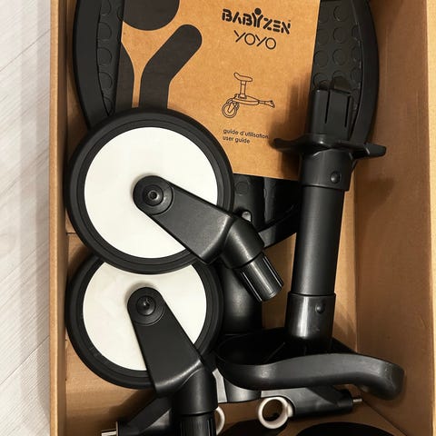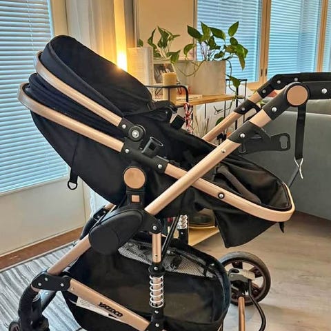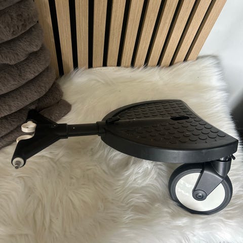 Myydään edullisesti kuvan lastenvaunut ja seisomalauta. Mukaan saa myös kiinnitysosan kaukalolle.