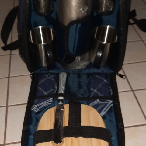 Myydään käyttämätön piknikreppu astiastoilla neljälle hengelle. Repussa on useita lokeroita ja kiinnityshihnoja aterimille, laseille ja lautasille. Mukana myös erillinen pullotasku, joka kiinnittyy repun sivulle pikalukoilla. Repussa on säädettävät olkahihnat, vetoketjullinen etutasku, ja erillinen kylmätasku.