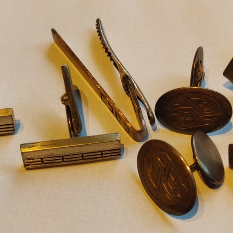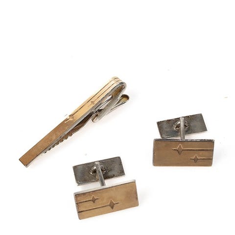 Vanha hopeinen kullattu setti miehelle kuten kuvassa. Vaatii putsauksen.