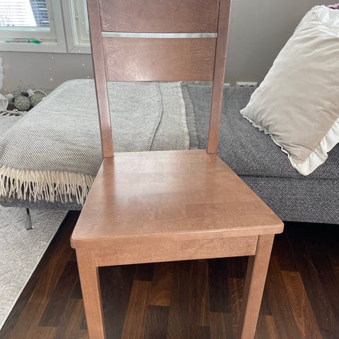 Myydään neljä hyväkuntoista puista ruokapöydän tuolia. Tuoleissa vaalea puunvärinen istuinosa ja siniseksi maalattu runko. Noudettavissa Jyväskylän keskustasta läheltä Kolmikulmaa.