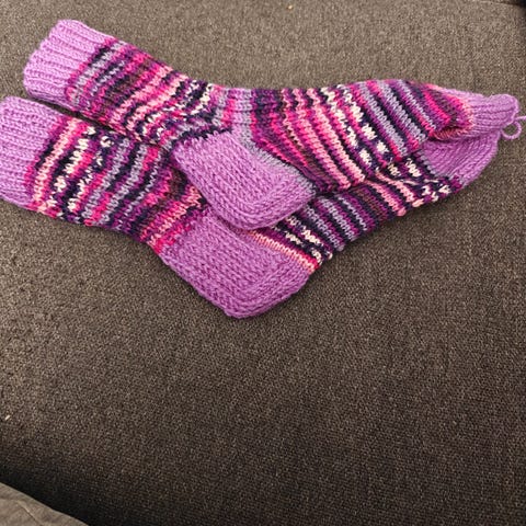 Neulottu Novitan 7 veljes langasta : 80% villaa/20%polyamidia. Vahvistettu kantapää.