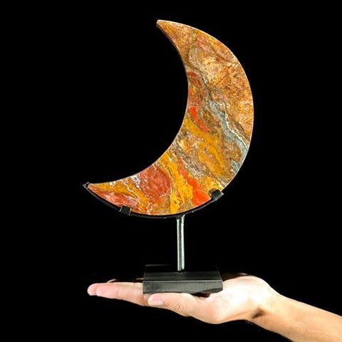 Kaunis kiillotettu puolikuu punaisesta Maligano-jasperista räätälöidyllä jalustalla.Maligano-jasperi on erityinen jasperin laji, jota löytyy Indonesiasta ja joka muodostuu muinaisten vulkaanisten kuumien lähteiden alueilla. Maligano-jasperi tunnetaan kontrastisista lämpimistä sävyistä sinisten ja harmaiden viereen, sekä upeista brecciatoituneista (murretuista ja parantuneista) kuvioista sekä hauskoista dendriittisistä kuvioista, mikä saa kiven usein näyttämään jokimaisemilta, joiden varrella on pieniä pensaita solisevan puron rinnalla.Arvioidut mitat mukaan lukien jalustaKorkeus: 28,3 cmLeveys: 18 cmVAROITUKSET:- Huomioithan, että kuvat on otettu pimeässä studiolla, värit voivat vaihdella ympäristön mukaan.- MAINITTU PAINO SISÄLTÄÄ PAKKAUSMATERIAALIN.TOIMITUS- Tuotteen lähetetään seurantakoodin kanssa DHL Parcelin, DPD:n tai PostNL:n välityksellä. Seuranta päivitetään Catawiki-lotissa, kun pakettisi on luovutettu.- Tarkista säännöllisesti, ettei pakettiasi palauteta meille; tällöin ostaja vastaa toisen lähetyksen kustannuksista.- Seurantaa Espanjaan ja Portugaliin varten käytä tätä linkkiä ja lisää Catawiki-lotistasi saamasi seurantanumero:https://clientesparcel.dhl.es/LiveTracking/Home- EMME YHDISTÄ TOIMITUKSIA!!!- Jos sinulla on kysyttävää paketistasi, ota yhteyttä Catawiki-viestipalvelun kautta. Yritämme vastata kolmen työpäivän kuluessa.