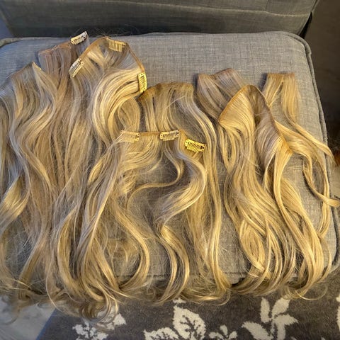 Rapunzel of Sweden 3 erillistä osiota klipsipidennystä. Väri on vaalea blondi ( hiukan hunajaan taittuva sävy) sopii hyvin omien hiusten lisänä tuuhentamaan hiusta ( ei tarvitse olla ihan sama sävy, menee hyvin eri vaaleiden hiusten sekaan).