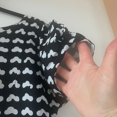 Marimekko naisten kesämekko, koko XS. Mekko on musta valkoisella kuviolla. Materiaali päällikankaassa on puuvillaa, vuorissa viskoosia ja polyesteriä (materiaalitiedot näkyvät pesulapussa). Mallissa on lyhyet hihat ja vyötärölle sidottava vyö. Sopii kesäkäyttöön ja arkipukeutumiseen.
