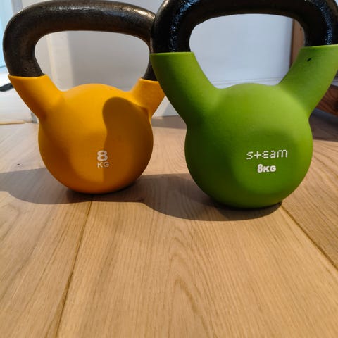 Kahvakuulat kotiharjoitteluun tai kuntosalille. Toinen kahvakuula on harmaa muovipintainen, jossa on vaaleansininen kahva, ja toinen on musta valurautainen kahvakuula. Sopivat erilaisiin voimaharjoitteisiin, kuten kyykkyihin, heilautuksiin ja ylävartalon liikkeisiin.