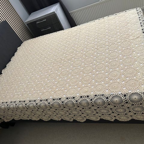 Kaunis, luonnonvalkoinen puuvillalangasta virkattu päiväpeitto. Peitto on painava, joten pysyy hyvin suorassa 🙂 Ommeltu pienemmistä virkatuista neliöistä.