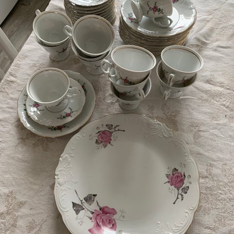 12 hengen astiasto, valkea kultareunukset sisältää kahvikuppi +asetti kakkulautaset sekä leivosvati + kermakko ja sokerikko