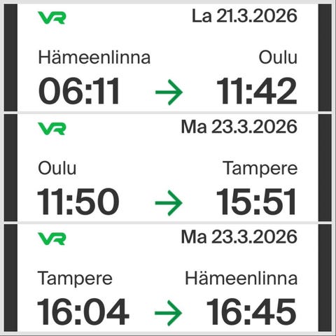 Vr junalippu Oulu-Turku&Turku-Oulu 26.3-29.3