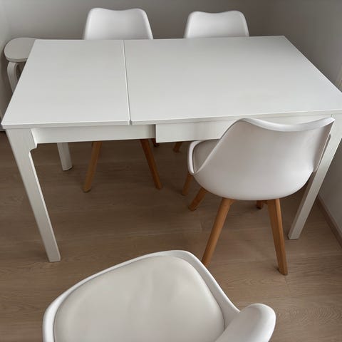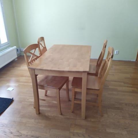 Kuvan ruokailu ryhmä myyntiin. Pöytä ja 4 tuolia joista yksi on hieman kärsinyt.