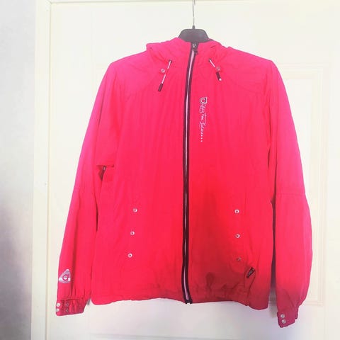 Kätevä ulkoilutakki monilla toimivilla yksityiskohdilla. Vettähylkivä. Reilu mitoitukseltaan. Huppu rullaantuu kauluksen sisälle , ja kauluksen sisäpuoli iholle miellyttävää materiaalia. Hihoissa heijastinnauhat. Helmassa ja hihoissa säätösysteemit. Selkäpuolen leikkaus varmistaa erinomaisesti ilmankierron. Vaikka takki sietää märkiä olosuhteita se ei hiosta. Käytetty mutta siisti ja juuri pesty. Punainen väri ei ole luonnossa ihan niin räikeä kuin kuvissa.