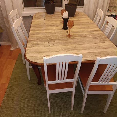 Pöytälevy saarniviilua, jalat massiivikoivua. Sanoisin, että ei juuri uudelle häviä, toki jotain pienenpientä jälkeä saattaa olla. Pinnassa on luonnostaan hieman rosoinen syykuvio.