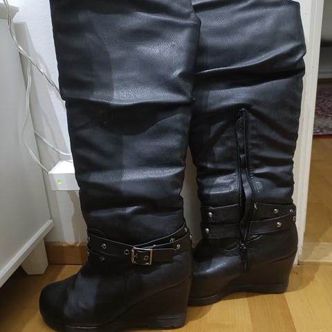 Hyvin vähällä käytöllä olleet, ei ollenkaan arkikäytössä. Koron korkeus 6cm, kengän korkeus/varren pituus maasta 43cm, varren suun leveys 19cm (litteänä). Maksu käteinen tai Mobilepay, nouto sovitusti.