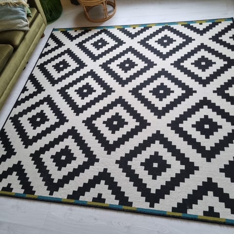 Kudottu villainen matto, jossa harmaa pohjaväri ja vaaleat tähtikuviot sekä raidat päissä. Sopii käytettäväksi esimerkiksi olohuoneessa, makuuhuoneessa tai eteisessä. Materiaali vaikuttaa tasaiselta ja kudotulta. Kuviointi on kaksipuolelta samanhenkinen, joten matto voidaan asetella tilaan tarpeen mukaan.
