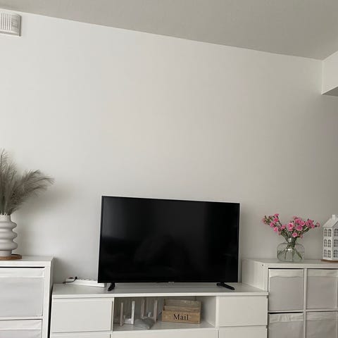 Samsung televisio. Ohut tasokuvanäyttö, jossa kaksi jalkaa ja erillinen kaukosäädin. Soveltuu esimerkiksi olohuoneeseen tai makuuhuoneeseen viihdekäyttöön. Tarkka malli, koko ja muut tekniset tiedot eivät käy ilmi kuvista.