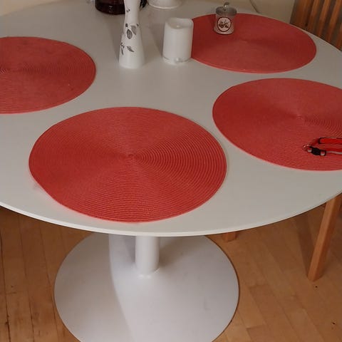 Kokopuinen pyöreä ruokapöytä. Korkeus 74cm ja halkaisija 99cm. Pinta on kulunut ja käytön jälkiä on. Kiinnikkeet on kuluneet, ruuvit vähän löysällä. Kuvista näkyy!