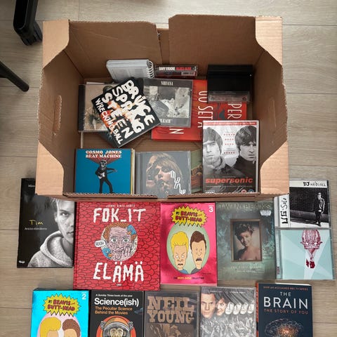 Sekalainen kokoelma dvd- ja cd-levyjä. Mukana useita dokumentti-dvd:itä, muun muassa historiallisia ja arkeologisia aiheita käsitteleviä levyjä (esimerkiksi Tsingis-kaanista, Teotihuacánin pyramideista ja Herculaneumista kertovia dokumentteja). Lisäksi joukossa on erilaisia cd-levyjä, kuten musiikkialbumeita ja peliaiheisia CD Gamer -levyjä. Levyt ovat koteloissa ja irrallisina, määrä ja tarkat nimet vaihtelevat kuvien mukaisesti.