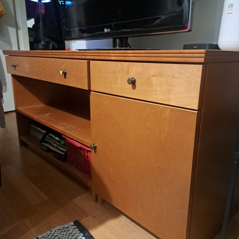 Jämäkkä ja hyvä lipasto, jossa muutama naarmu/kolhu, josta kuvat. Merkistä en osaa sanoa.