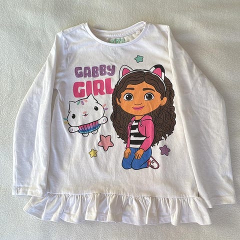 Hyvää kuntoinen t-paita Gabby nukketalo koko 128, mutta sanoisin enemmän koko 122.