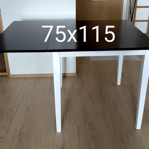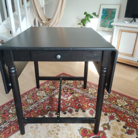 Sivut saa laskettua alas, tällöin pöydän leveys 59cm. Etupuolella laatikko.