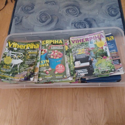 Sekalainen erä puutarha-aiheisia lehtiä, muun muassa Puutarha- ja Vihertie-lehtiä. Lehdet on pakattu muovilaatikoihin. Sopivat esimerkiksi puutarhanhoidosta, kasveista ja pihan suunnittelusta kiinnostuneelle luettavaksi ja ideoinnin tueksi. Tarkempi määrä ja vuosikerrat eivät käy ilmi kuvasta.