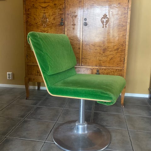 Yrjö Kukkapuron suunnittelema tuoli, jossa on metallirunko ja verhoiltu istuin sekä selkänoja. Istuinosassa ja selkänojassa on puinen tausta ja päällä kangasverhoilu. Tuoli soveltuu esimerkiksi ruokapöydän tai työpisteen istuimeksi. Edessä kangas rikki.