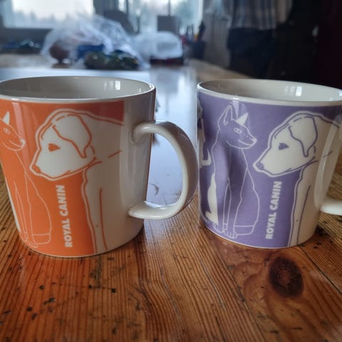 Arabia Royal Canin nro 6 -muki, harmaa. Mukissa on valkoisia koira- ja kissakuvioita ympäri mukin. Pohjassa merkinnät: Royal Canin, Arabia, nro 6, design Niina Aalto. Soveltuu juomamukiksi keittiöön tai kahviastiastoon. Löytyy 2kpl yhteis hintaan 65€