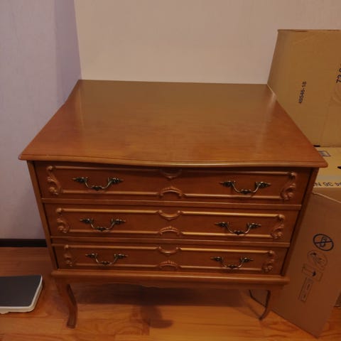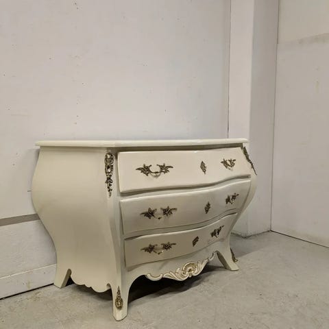 Hienossa kunnossa pidetty Rokokoo tyylin kolmen laatikon lipasto myytävänä. Runko tukeva. Vetolaatikot toimivat hyvin. Ei hajuja.