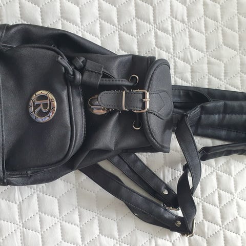 Hyväkuntoinen musta reppu, 100 % nahkaa. Repun korkeus 37 cm, leveys ylhäällä 20 cm, leveys pohjassa 30 cm.