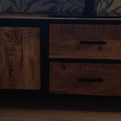 Korkealaatuinen H&H:n (Henders & Hazel) TV-taso, joka on valmistettu massiivipuusta – aitoa, paksua puuta, jolla on kaunis syykuvio.