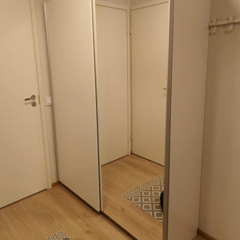 Tilava liukuovikaappi peiliovilla remontin tieltä pois. Kaapin syvyys 67cm + "lippa" 15,5cm.