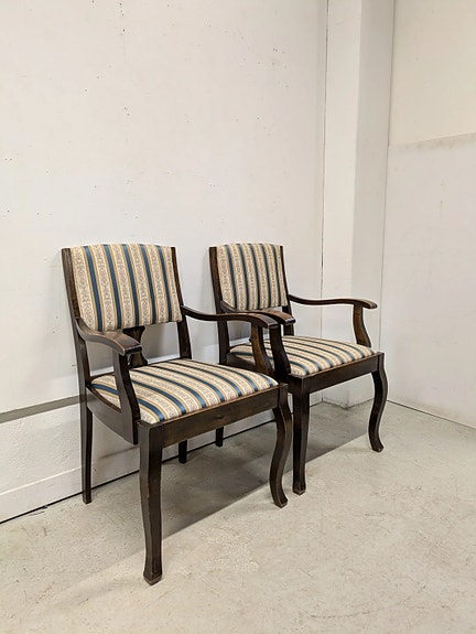 Nämä kauniit Hepplewhite tyylin tuolit etsivät uutta kotia. Tuolien liitoksissa väljyyttä ja puuosissa kolhua ja pieniä koriste puutoksia Verhoilut ehjät. Myydään settinä ja projektina. Istuinkorkeus 49 cm.