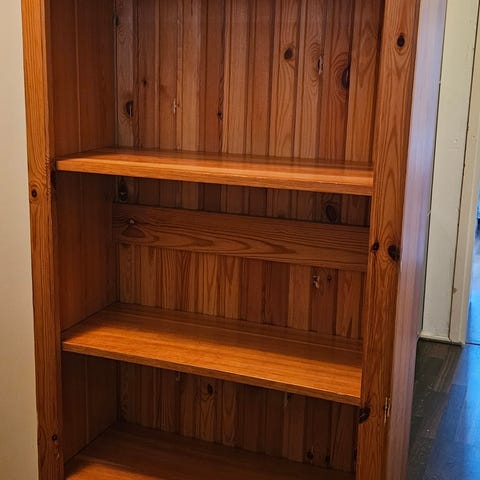 Hyväkuntoinen kirjahylly. Kattolevy parista paikkaa hieman kastunut kukkien takia. Muuten ei vikoja.