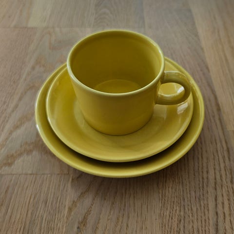 14 kahvikuppia (1.25dl) asetteineen, kannellinen sokerikko ja kermakko. Yhdessä kahvikupissa pienen pieni särö, muuten virheetön. Vähän käytetty, väri keltainen.