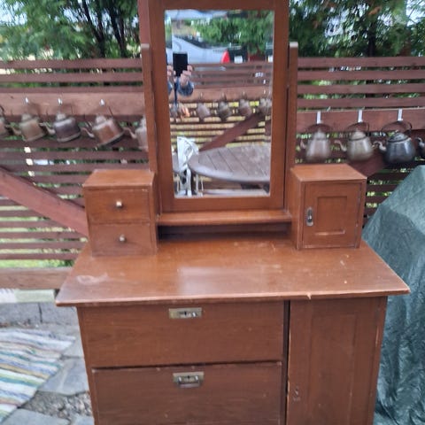 Takaseinässä vaurio muuten ehjä. Peilissä tummanruskea kehys, mitat 120x80.