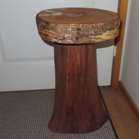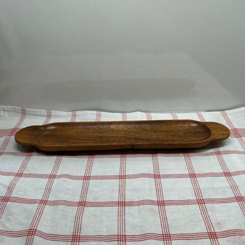 Puinen tarjoilulauta, jossa polttotekniikalla tehtyjä puu kuvioita. Metalliset vetimet, pohjassa pienet tassut, jotka pitävät laudan irti pöydän pinnasta.