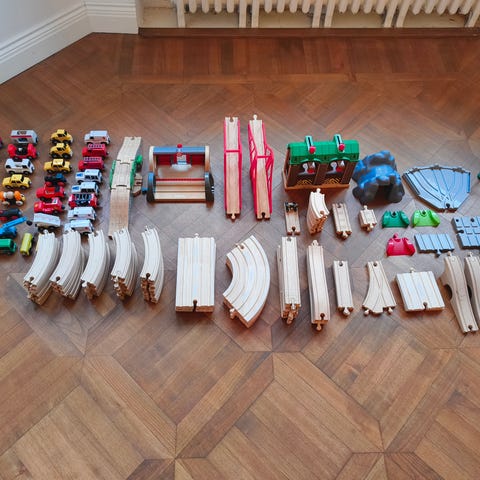 BRIO / jonkun toisen merkin puinen junarata. Puinen junaratasetti, jossa useita erilaisia suoria ja kaarevia kiskonosia sekä lisäosia. Sopii BRIO-junaratojen ja vastaavien puisten junaratojen laajentamiseen ja yhdistelyyn lasten leikkeihin.