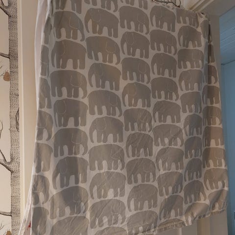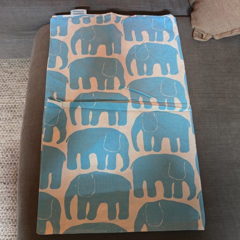 Finlayson Elefantti lakanasta tehty koriste tyyny liinat 2 kpl. Keltavalkoinen kuosi, jossa toistuva elefanttikuvio.
